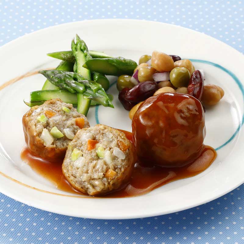 鶏肉(日本)、野菜(たまねぎ、にんじん、えだまめ(大豆を含む)、水くわい、ねぎ、しょうが、キャベツ)、粒状植物性たん白、豚脂、ごま、粉末状植物性たん白、水溶性食物繊維、食塩、香辛料、酵母エキス、砂糖/加工デンプン、セルロース、炭酸Ca、ピロリン酸第二鉄、カラメル色素、ソース(トマトケチャップ、食酢、砂糖、水溶性食物繊維、小麦不使用しょうゆ、トマトペースト、ウスターソース、トマトミックスジュース、りんごジュース、にんじんペースト、酵母エキス/増粘剤(加工デンプン、キサンタンガム)、カラメル色素)、揚げ油(なたね油)