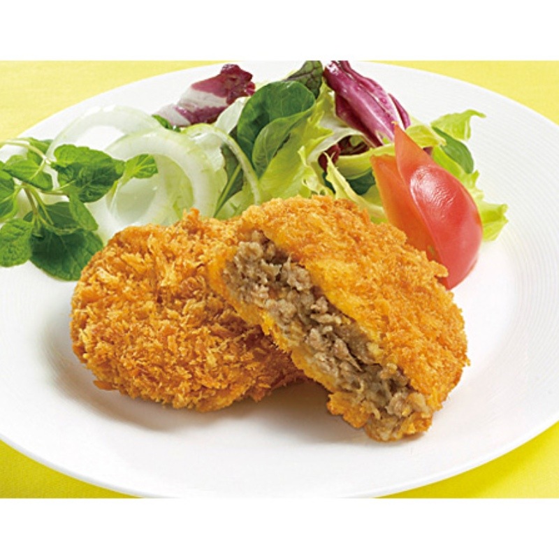 粒状植物性たん白(国内製造)、つなぎ(粉末状植物性たん白、パン粉、卵白粉)、牛脂、牛肉(オーストラリア、ニュージーランド、その他)、ソテーオニオン、加糖脱脂粉乳、ウスターソース、砂糖、香辛料、食塩、さとうきび抽出物粉末、衣(パン粉(国内製造)、でん粉、小麦粉、植物油脂、デキストリン、粉末状植物性たん白、大豆粉)/調味料(アミノ酸)、着色料(アナトー、ココア)、増粘多糖類、加工デンプン、香料、乳化剤、(一部に小麦・卵・乳成分・牛肉・大豆・りんごを含む)