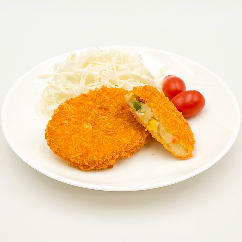 にんじん・たまねぎ・とうもろこし・グリンピース入りの、ほんのり甘口に仕上げた野菜コロッケです。国産じゃがいもを使用しております。